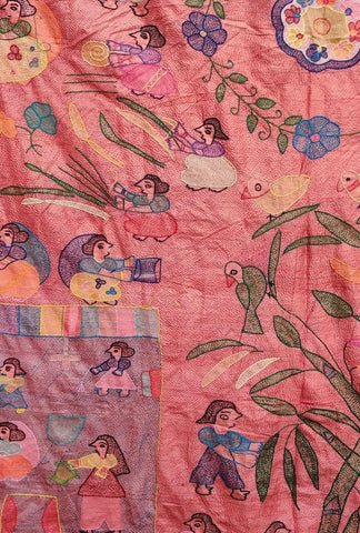 It uses a simple running stitch technique. The craft employs multiple layers of fabric, usually old saris, creating a quilt-like structure. Designs are first drawn on the fabric, then embroidered using colorful threads. Themes have evolved to include contemporary issues like women's rights, literacy, and health awareness.