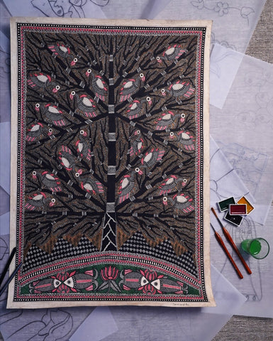 Madhubani art, originating from the Mithila region of Bihar, India, is a traditional folk art known for its vibrant colors and intricate patterns. This art form dates back to ancient times and is deeply rooted in Hindu mythology and local rituals. Madhubani paintings were traditionally done on walls and floors of homes with natural dyes and pigments, and have now expanded to paper and canvas.