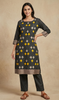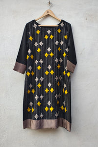 Charcoal Grey Chanderi Straight Kurti is enhanced with mustard and beige hand applique and linear Sujani embroidery has boat neck and 3/4th sleeves. The kurti is further uplifted with wide Chanderi patch in deep beige colour on sleeves and kurti hem.