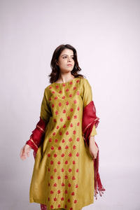 Lime Green Floral applique on the front with wild silk in red and maroon colour has boat neck, straight fit and regular 3/4th sleeves.