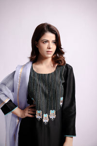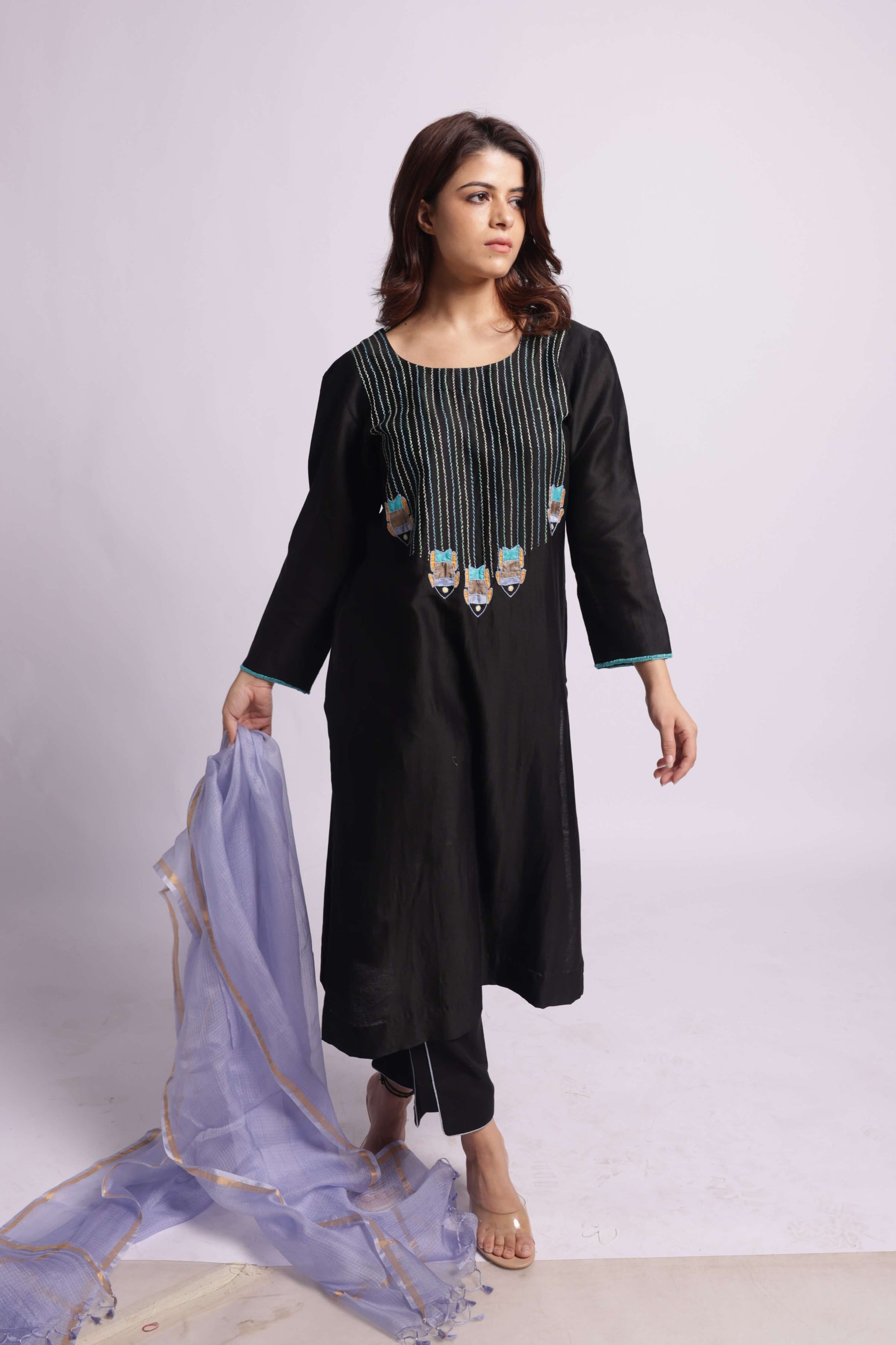 Black cotton-silk straight fit kurta has linear sujani embroidery on yoke and uplifted with fish applique in wild silk fabric. The kurti has 3/4th sleeves enhanced with kaaj stitch. The kurti comes with a pair of cotton trouser has piping detail on outer seam and a kota silk dupatta.