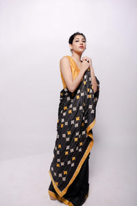 Black wild silk saree with surface applique on palla and sujani embroidery all over. The saree has wide mustard yellow chanderi border finish with a hint of beige accent. The saree is paired with a stitched v neck and sleevless mustard yellow chanderi sujani embroidered blouse for styling purpose only. Comes with an unstitched cotton silk mustard yellow chanderi blouse piece.