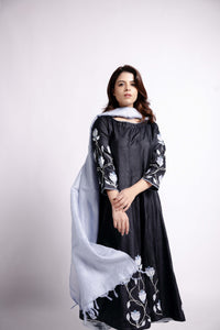 Black Wild Silk anarkali set has floral surface hand applique work on sleeves and hem in different shades of light blues enhanced with silver pita zari work. The anarkali set is finished with kaaj stitch on neckline and sleeves and has piping finishing on the hemline. The set is completed with a pair of cotton pencil pants and all over silver mukaish embroidered wild silk tasselled finishing dupatta.