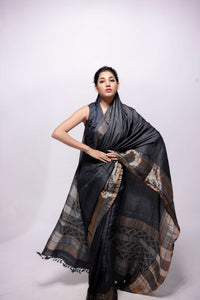 Brown wild silk saree with woven zari borders and palla has hand embroidered sujani on the palla , zari and finished with tassels.. The saree is paired with fine premium cotton blouse for styling purpose only. Comes with an unstitched wild silk blouse piece in the same colour.