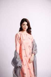 Peach Kurti has motif of birds in surface applique with wild silk fabric and accentuated with sujani embroidery.The kurti has round neck with detailed V-slit.