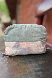 Unisex chanderi upcycled utility pouch with metal zipper has chindi pullar.