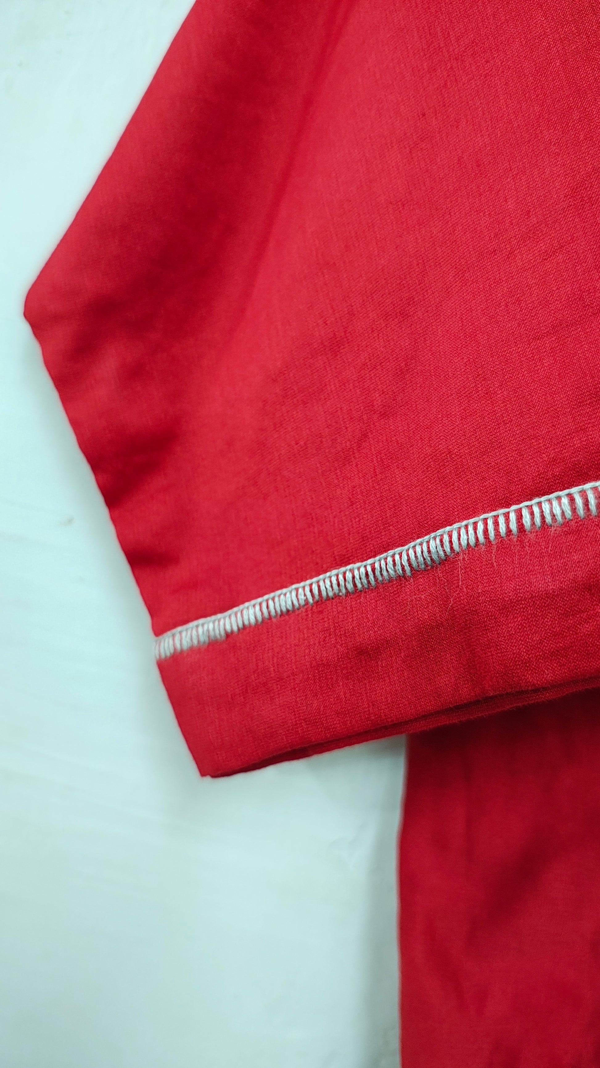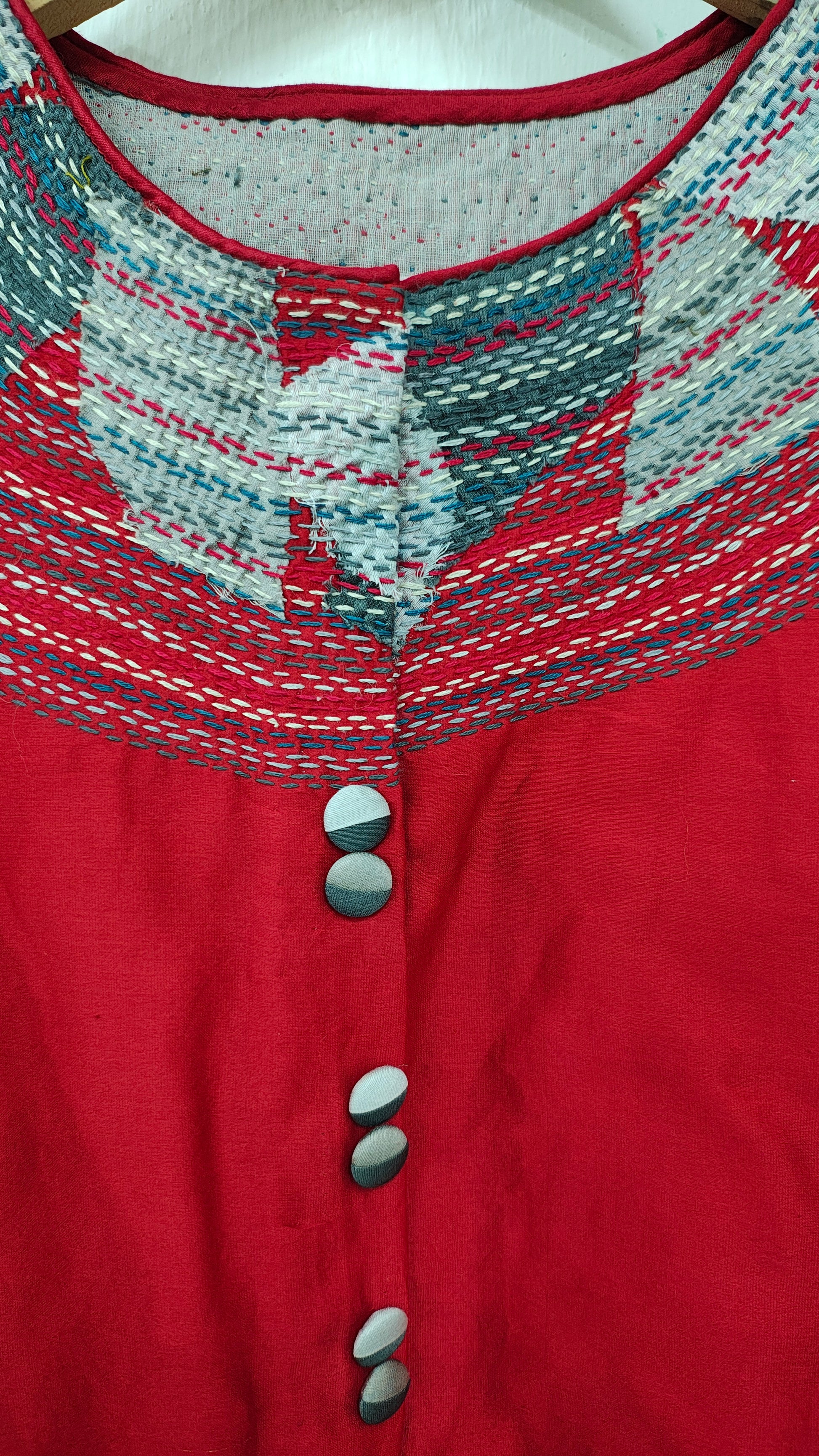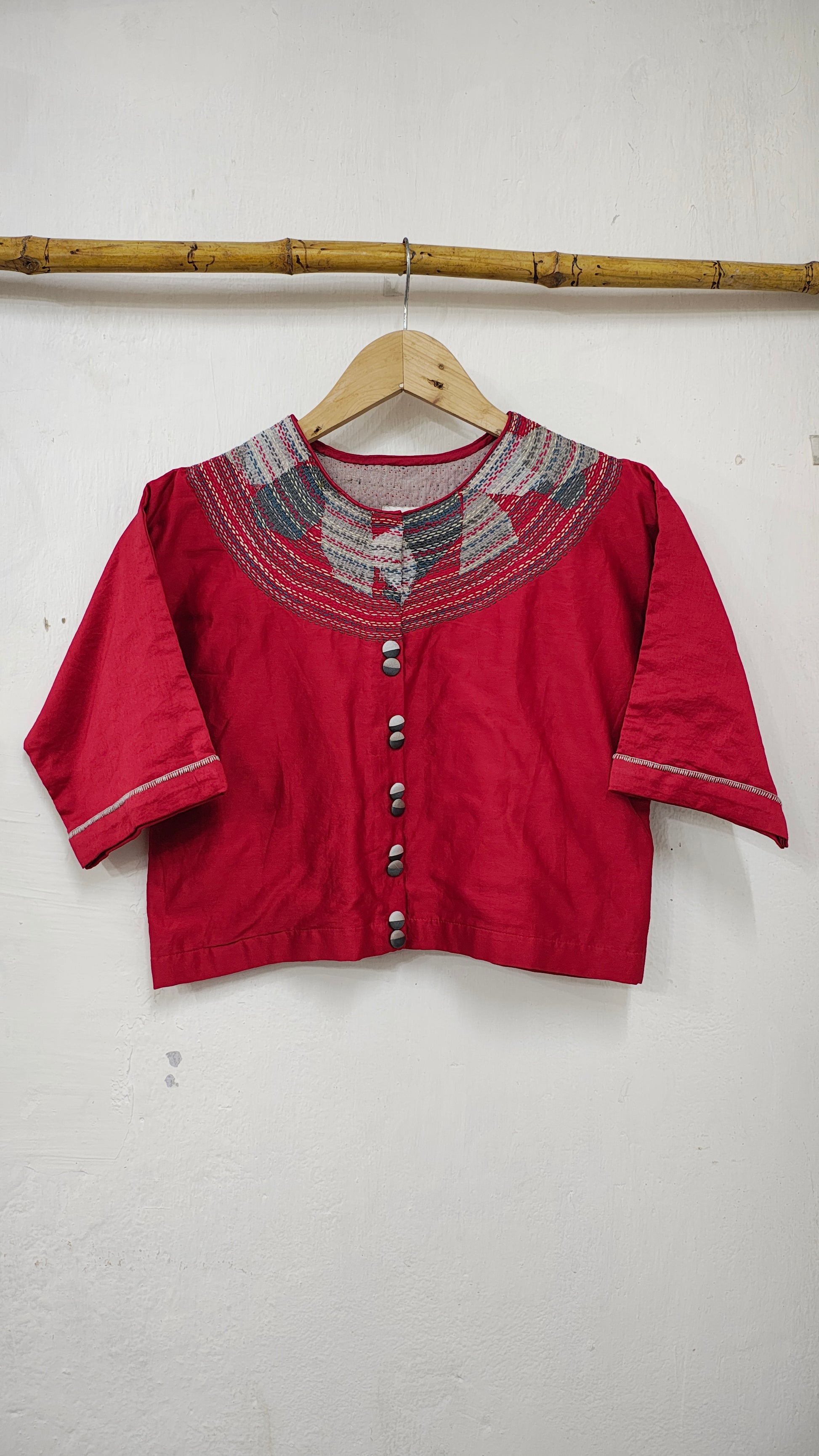 Red Chanderi crop top has round neck uplifted with multi-colour patch work and hand embroidered Sujani has centre front fabric button detail with hook and eye closure, and half roll-up sleeves accentuated with button-hole stitch.