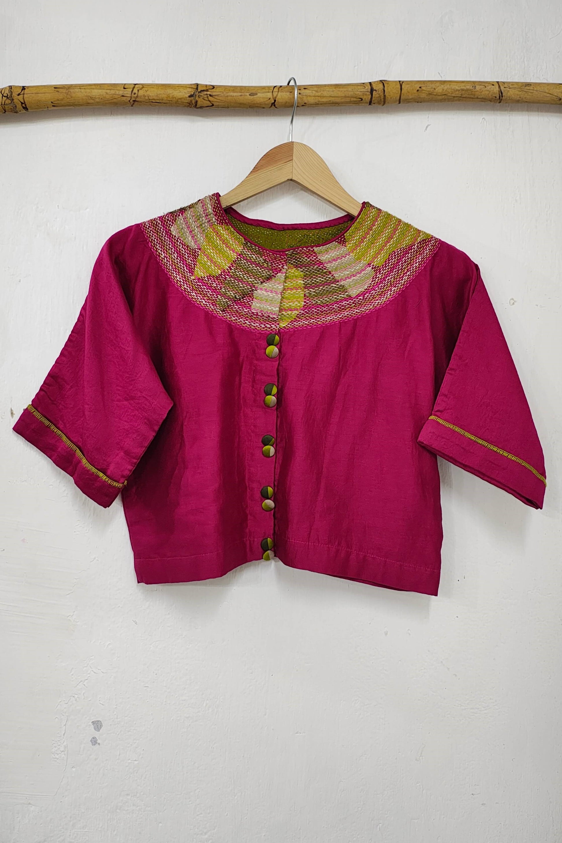 Rani Pink Chanderi crop top has round neck uplifted with multi-colour patch work and hand embroidered Sujani has centre front fabric button detail with hook and eye closure, and half roll-up sleeves accentuated with button-hole stitch.