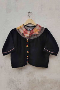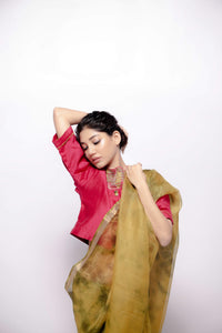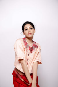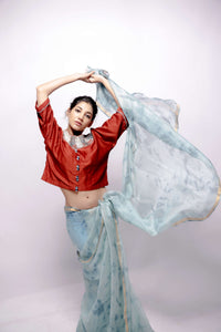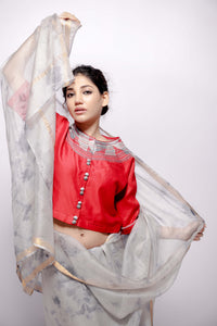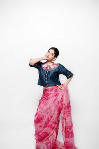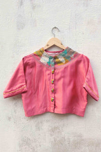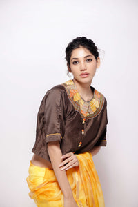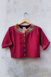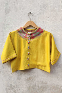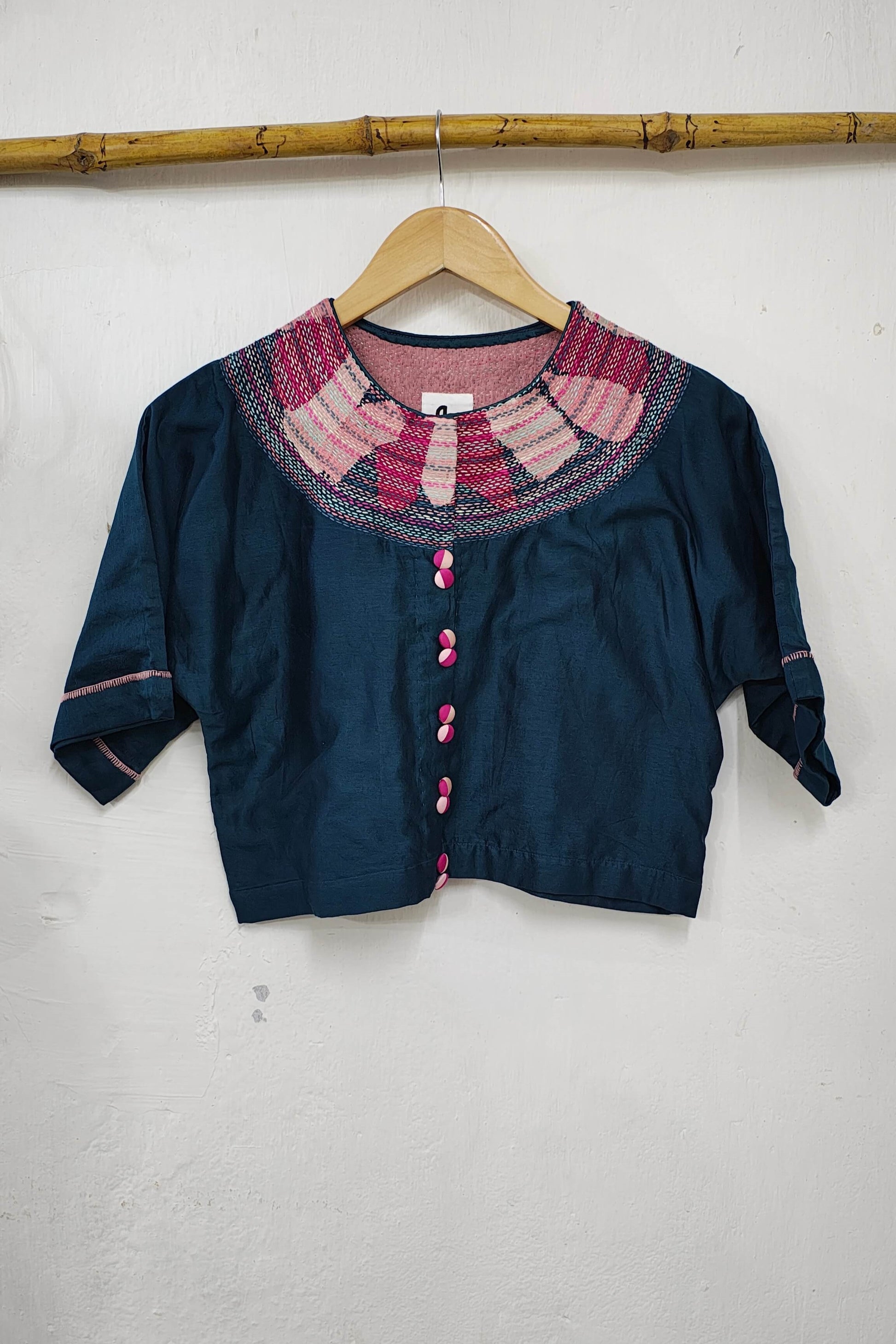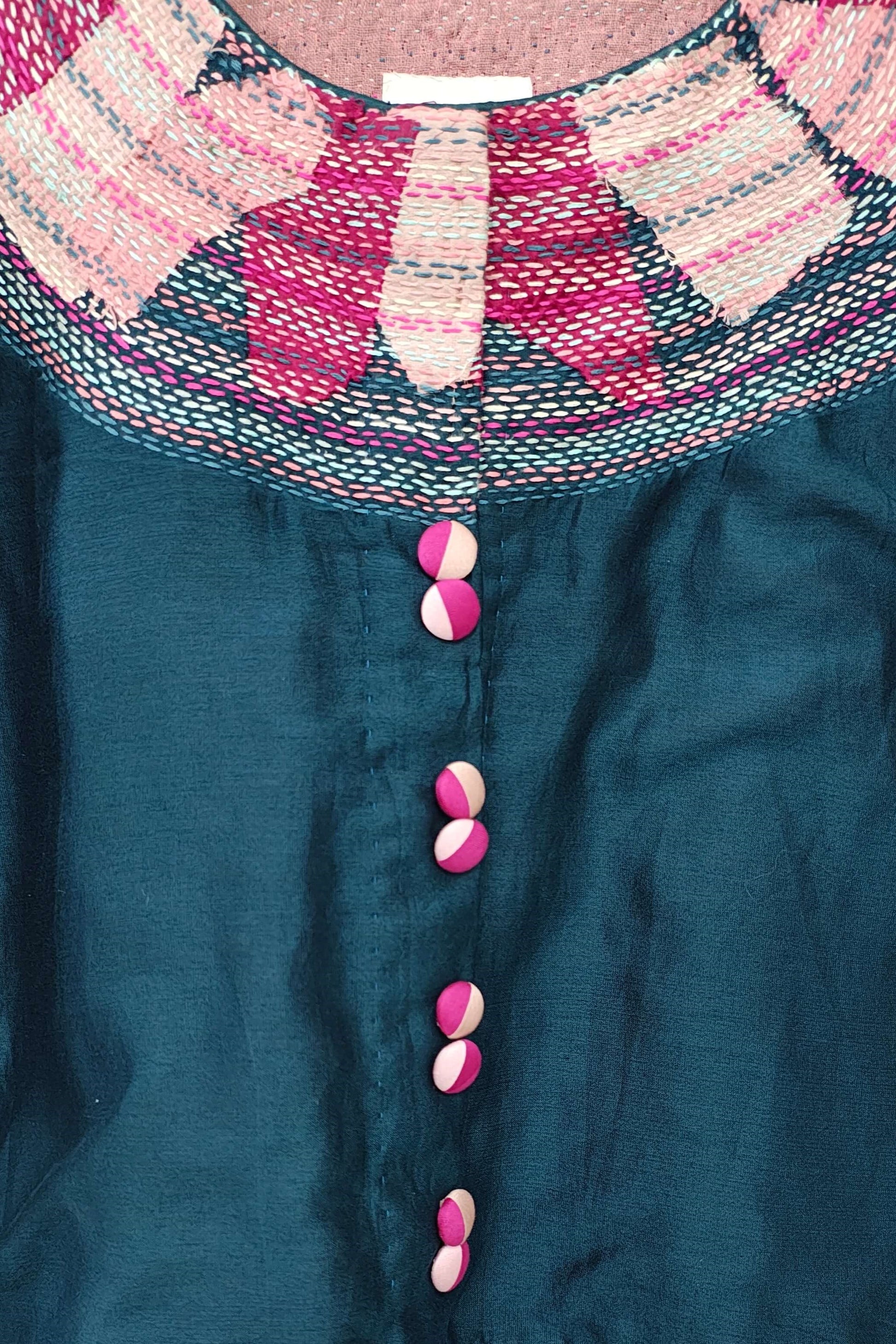 Teal Chanderi crop top has round neck uplifted with multi-colour patch work and hand embroidered Sujani has centre front fabric button detail with hook and eye closure, and half roll-up sleeves accentuated with button-hole stitch.