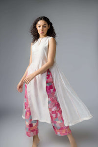 The pant set has a lightweight kurta and Pants. The Sleeveless kurta is in off-white chanderi fabric on the yoke and kota silk panels with high slits on the sides. The kurta has a round neck with sujani emobrodery. The Pants are shades of pink chindi patchwork with pockets and partial elastic on the back.