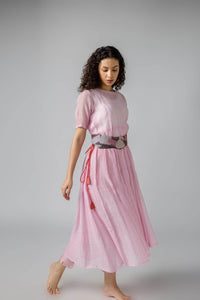 This powder pink solid Chanderi kurta set in anarkali style has elbow sleeves and is teamed with Bihart's signature sujani hand embroidered belt in multi-colour on an upcycled base. The kurti is paired with chanderi slip-on trouser.