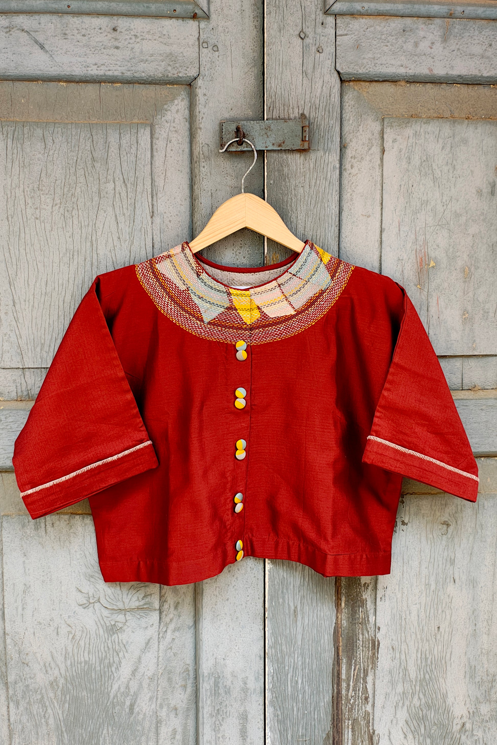 Women Rust Chanderi crop top has round neck uplifted with multi-colour patch work and hand embroidery Sujani has centre front fabric button detail with hook and eye closure, and half roll-up sleeves accentuated with button-hole stitch.