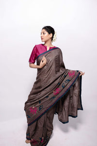 Deep Grey Wild silk with floral applique work on palla and hem. The saree has 1 inch of teal chanderi border with hint of magenta accent. The saree is paired with a stitched round neck front slit and elbow sleeve magenta chanderi sujani embroidered blouse for styling purpose only. Comes with an unstitched Pink chanderi blouse piece.