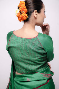 Women Green and Pink reglan sleeve wild silk blouse has tucks detail at the back, front v-neck and front closure.