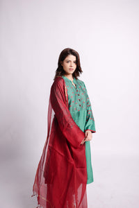 Green embroidered empire style kurti has mandarin collar with geometric applique and sujani embroidery. The kurti comes with a pair of straight trouser and a kota silk dupatta.
