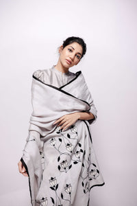 Grey wild silk with floral applique work on palla and hem. The saree has half inch of black chanderi border finishing. The saree is paired with a stitched extended collar neck and puff sleeve sujani embroidered blouse for styling purpose only. Comes with an unstitched grey chanderi blouse piece.