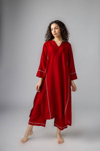 The Kalidar kurta set in red chanderi has round with v slit neckline and straight full sleeve. The kurta is accentuated with button hole stitch embroidery in cameo blue colour paired with a straight wide leg chanderi trouser with a sheer organza dupatta finished with wild silk border of 1 inch.