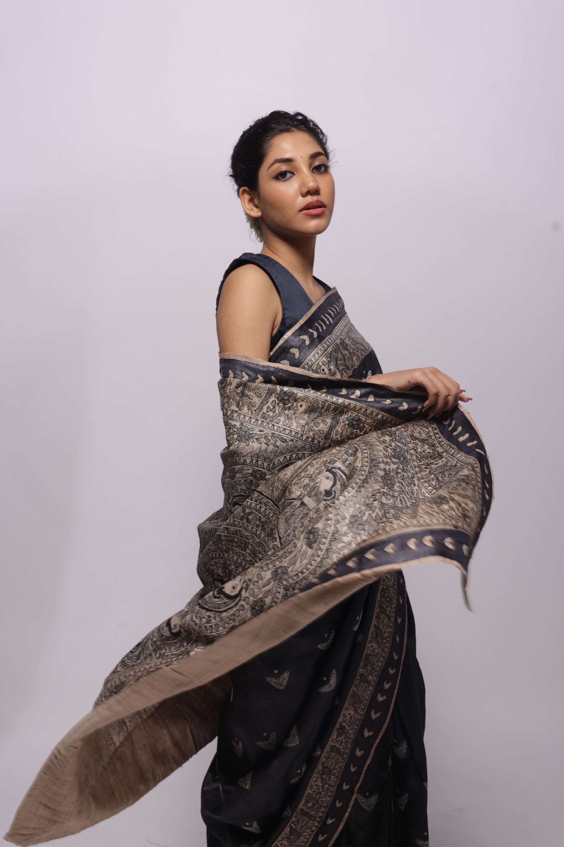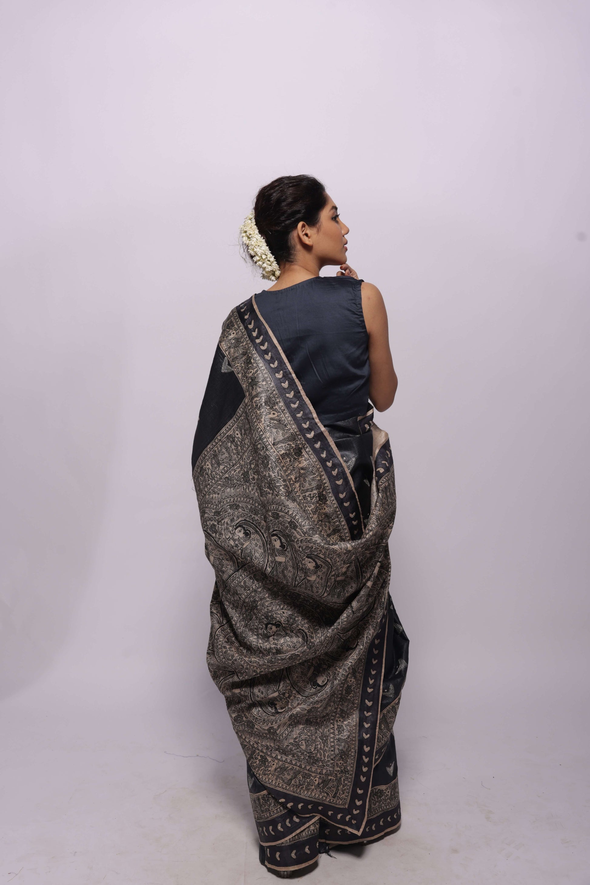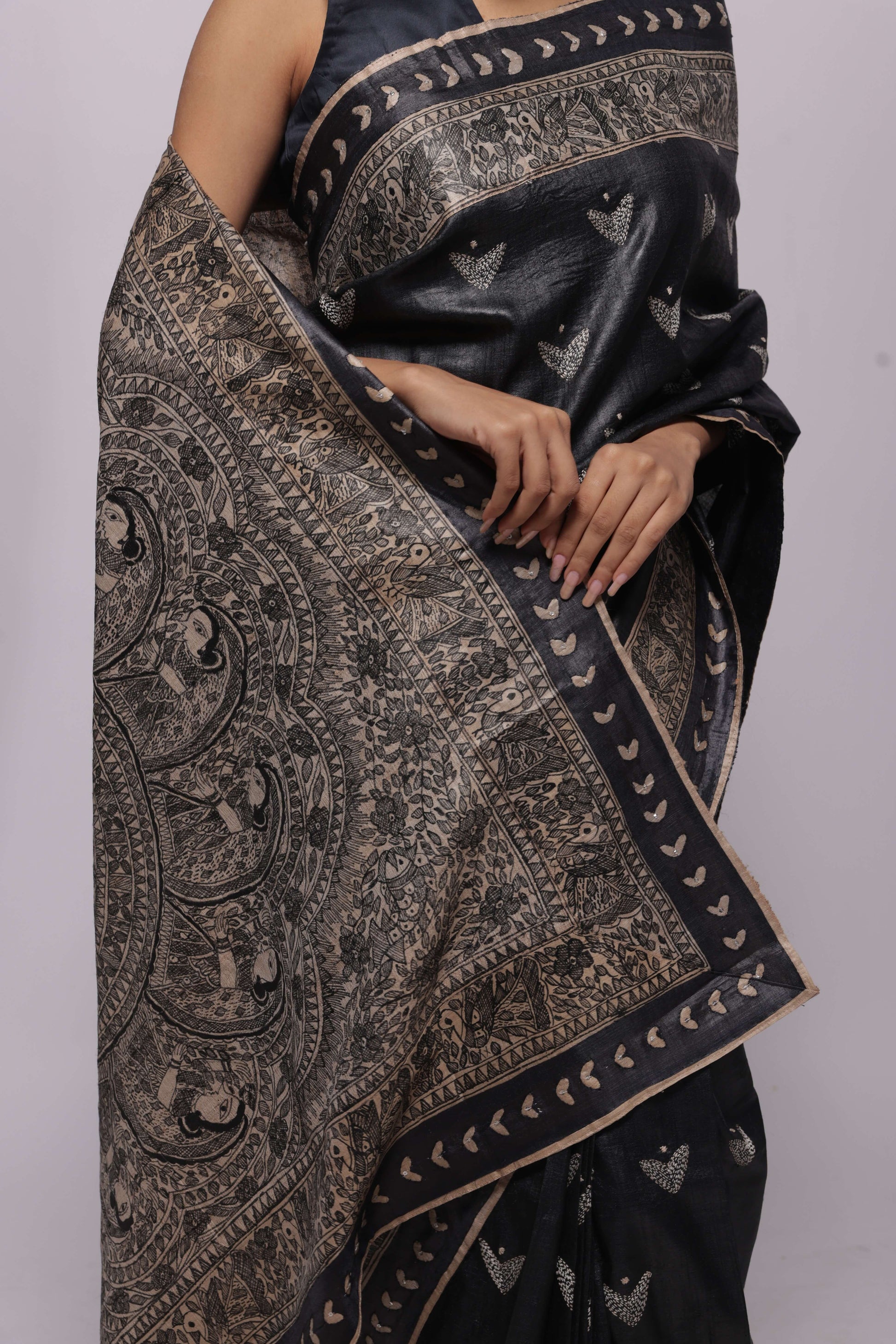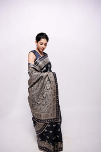 Pure handwoven wild silk saree with black hand-painted Madhubani all over the saree. Saree border is emhanced with sequince work. One saree takes about two to three weeks to paint. Comes with an attached blouse piece with handpainted madhubani.