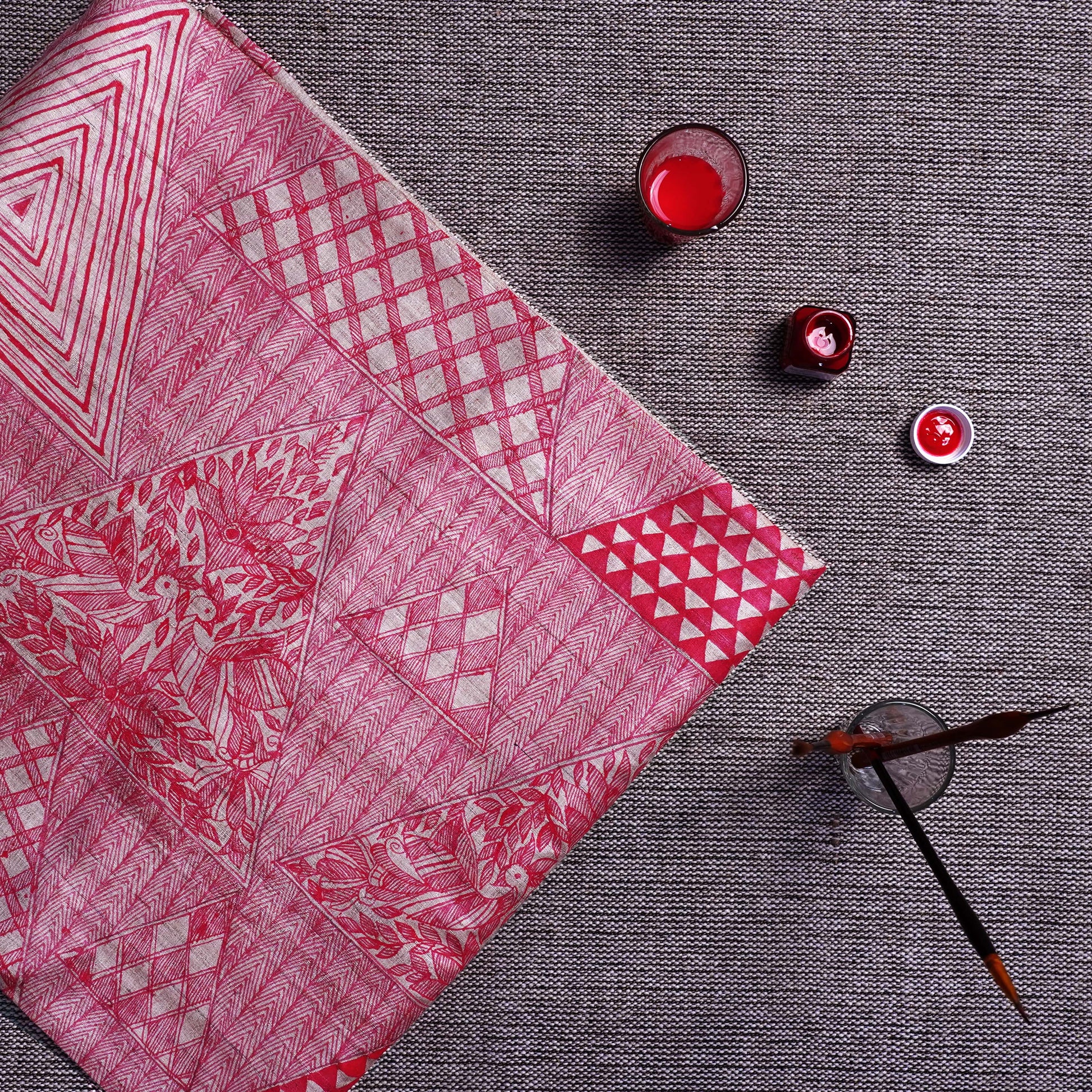 Pure Wild silk beige saree hand painted in wide geometric madhubani art on border and palla in red colour. The saree comes with an unstitched blouse piece.