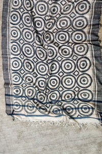 Pure handmade beige silk dupatta hand embroidered in sujani with black thread. The dupatta is further enhanced with woven borders and tassels.