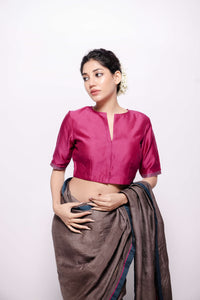 Magenta chanderi sujani embroidered bouse has round neck and slit detail, and regular elbow sleeves.
