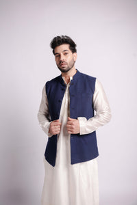 Men handwoven pure cotton twill nehru jacket in navy blue colour has mandarin collar, full button placket and three pockets.
