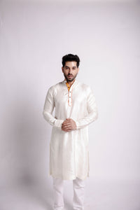 Men Wild Silk Off-White Kurta is embroidered on placket and armhole. The kurta full sleeves has pin tucks detail and straight fit hem.