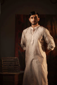Chanderi Men Beige Sujani hand embroidered in teal blue thread is straight fit regular sleeve style and straight hem.
