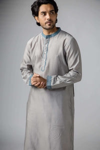 Chanderi Men Grey straight kurta in hand embroidered sujani on neckline and sleeve cuffs, accentuated with buttonhole stitch on placket and has straight hem.