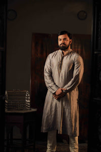 Chanderi Men grey straight kurta in fine hand embroidery has regular styling with mandarin collar and straight hem.