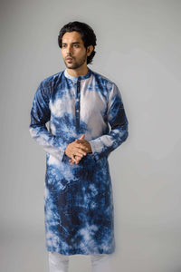 Chanderi Men Tie-Dye straignt kurta in blue and white colour has geometric thread work and straight hem.