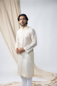 Wild silk Off-white men kurta is embroidered with buttonhole stitch in shaded green and orange colour in neckine and placket. The kurta has mandarin collar , regular fit and straight hem.