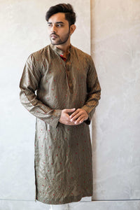 Wild silk Olive Green straight men kurta has sujani hand embroidery on front and on sleeves.The kurta has mandarin collar , regular fit and straight hem.