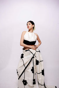 Women Off-white and black halter neck wild silk blouse has beck hook and eye closure.