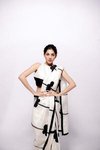 Off-White and and Black organza stripe and big flower applique work wild silk saree. The saree is paired wth a halter neck off white and black wild silk blouse for styling purpose only. Comes with an unstitched off white wild silk blouse piece.