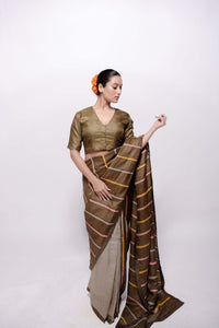Contemporary Olive Green multi-colour block stripes wild silk saree. Embroidered in sujani at saree hem and finished with olive colour border of 1 inch.The saree is paired with a v neck sujani embroidered colour block wildsilk blouse for styling purpose only. Comes with an unstitched olive green wild silk blouse piece.