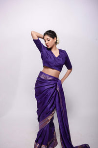 Purple solid cotton blouse has v-neck, regular elbow sleeves and front hook and eye closure.
