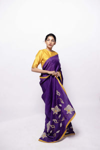 Purple Wild silk with double floral applique work on palla and hem. The saree has 1 inch of mustard yellow cotton silk border finsh. The sare is paired with a stitched zero neck half sleeve mustard yellow cotton silk sujani embroidered blouse for styling purpose only. Comes with an unstitched chanderi blouse piece.