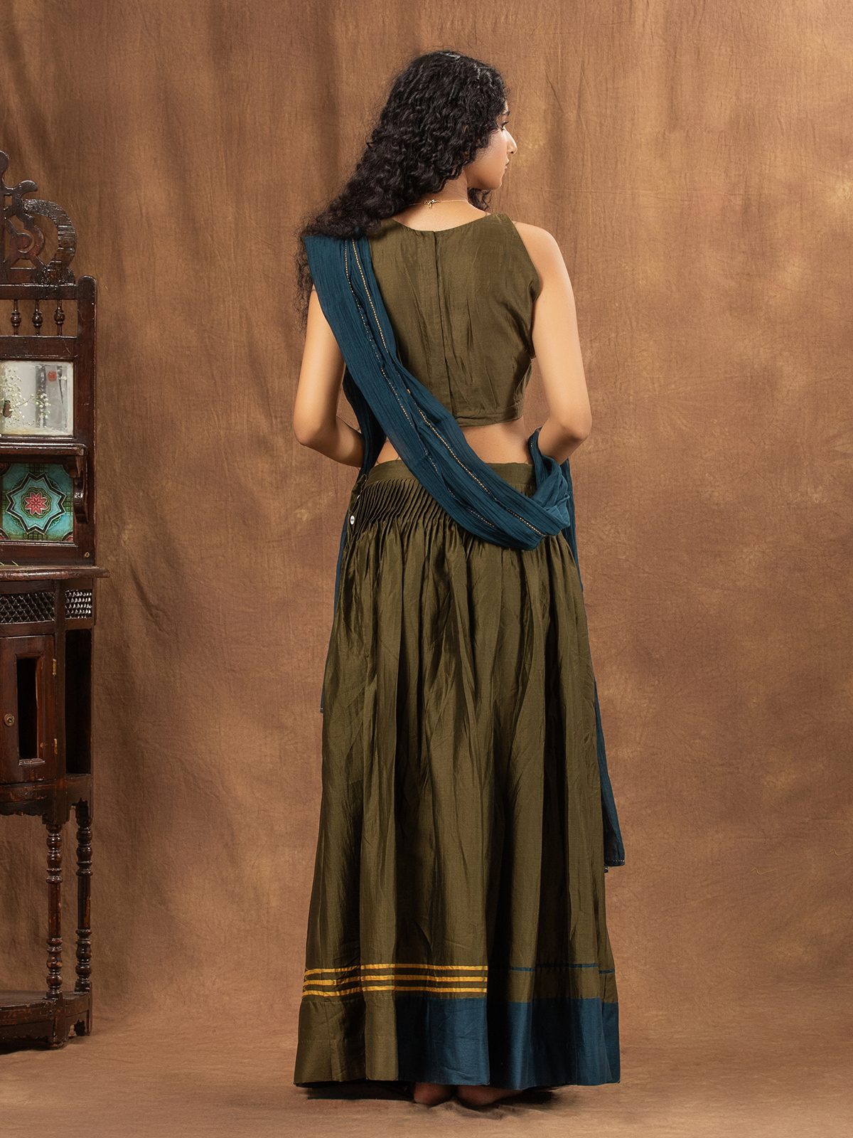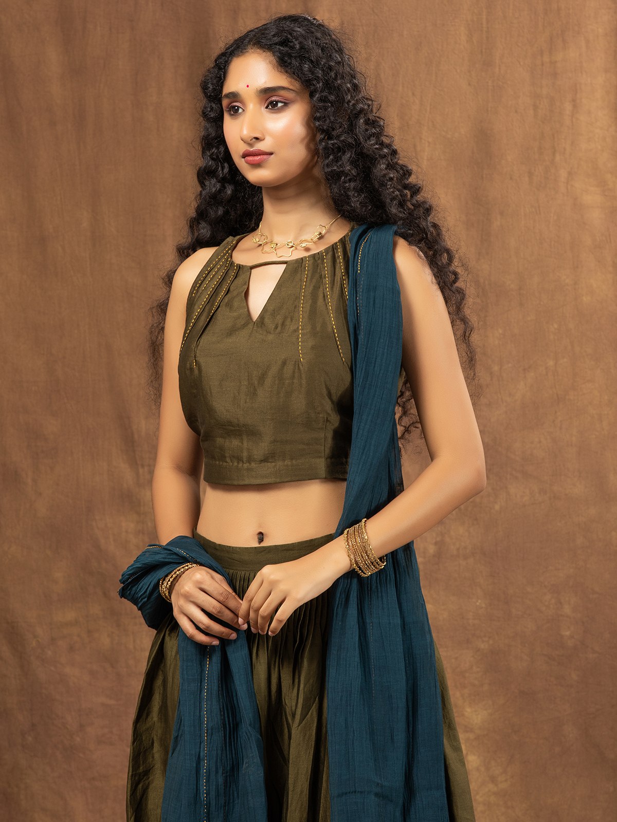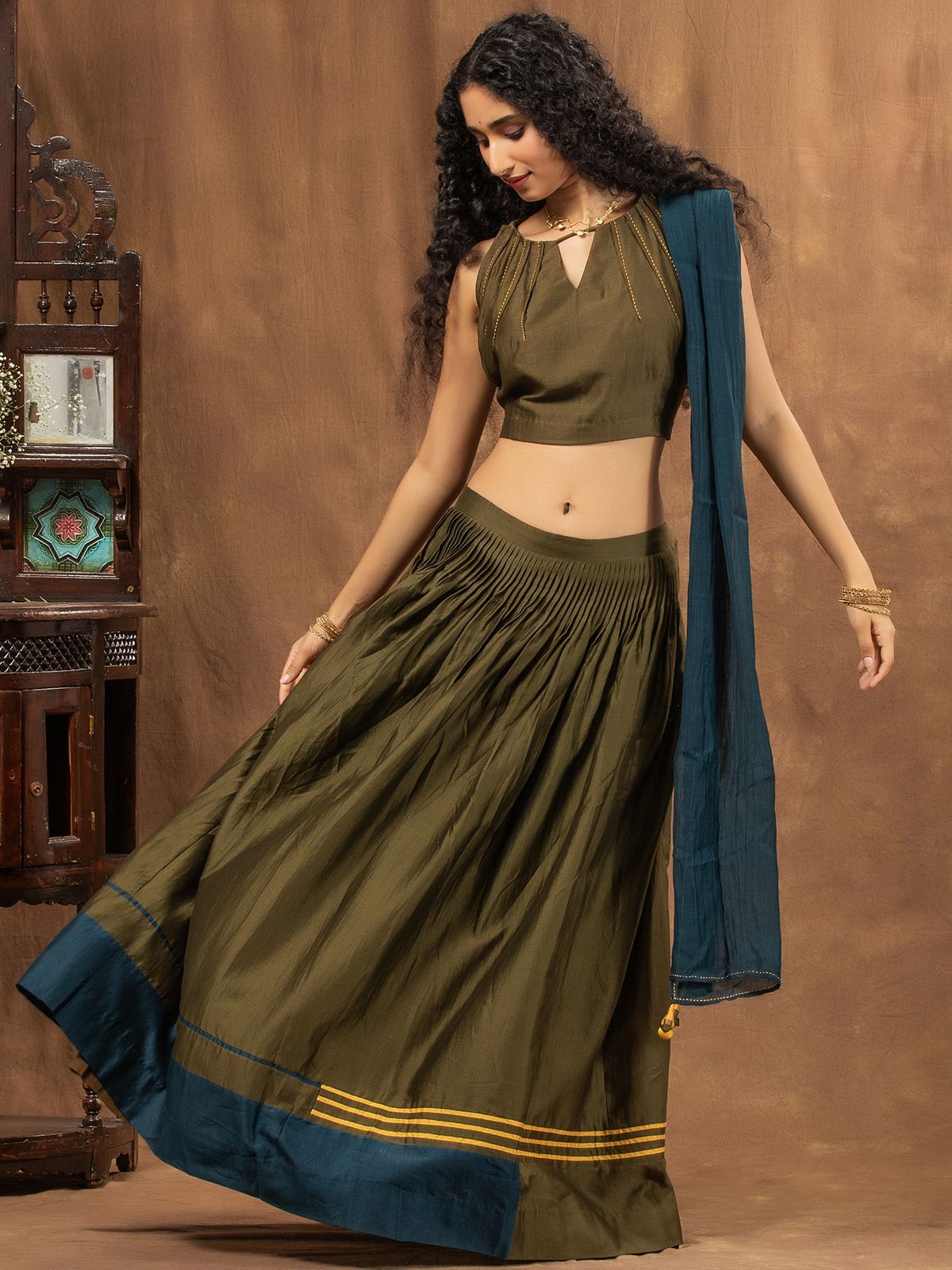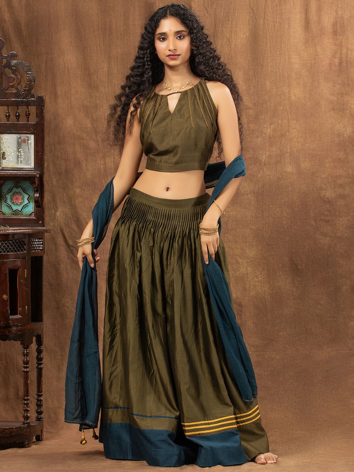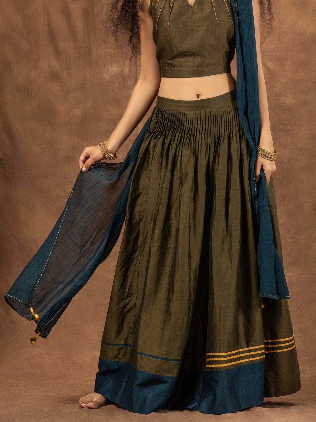 Bold and contemporary, this olive green skirt set reimagines festive dressing through modern lens. The fluid, solid skirt is elevated with subtle colour-block panels in rich teal and mustard yellow. Paired with sleek Sujani embroidered halter-neck blouse, the silhouette is youthful offering a flattering neckline and back hook & eye closure. Completing the ensemble with teal sheer Sujani embroidered dupatta finished with handcrafted tassels on each corner. The model is wearing size S.