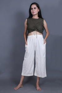This Classic solid pure cotton in olive green crop top has rouched detail at the center front, no sleeves and button loop closure at the back.