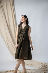 Cotton v-neck mid length dress accentuated with linear sujani in off white thread on front and back tucks.