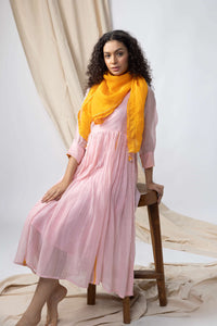 This sheer chanderi maxi dress has cotton kota back yoke detail and flared hem, 3/4th sleeve with contrast colour cuff. The dress comes with a cotton silk square scarf with sujani and tassel detail and a cotton slip.