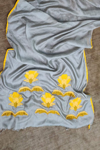 Pure handmade silk fabric with handwork applique motifs on dupatta palla and a yellow patti on two sides.