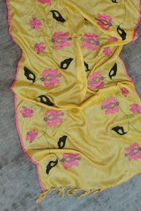 Pure handmade silk fabric with handwork applique motifs on dupatta border.