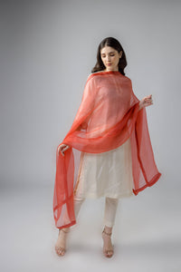 This straight fit wild silk kurta has center placket front closure, and has pleated tucks detail at the center back of the kurta and on sleeves hem paired with chanderi slip-on trouser with peach sheer organza dupatta has wild silk border in 1 inch.