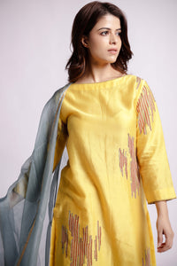 Women Yellow abstract lines sujani embroidered in multi colour straight fit kurti has 3/4th regular sleeves, boat neck and straight hem.