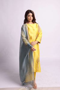 Women Yellow abstract lines sujani embroidered in multi colour straight fit kurti has 3/4th regular sleeves, boat neck and straight hem. The kurti comes with cotton wide leg trouser and a kota silk dupatta.