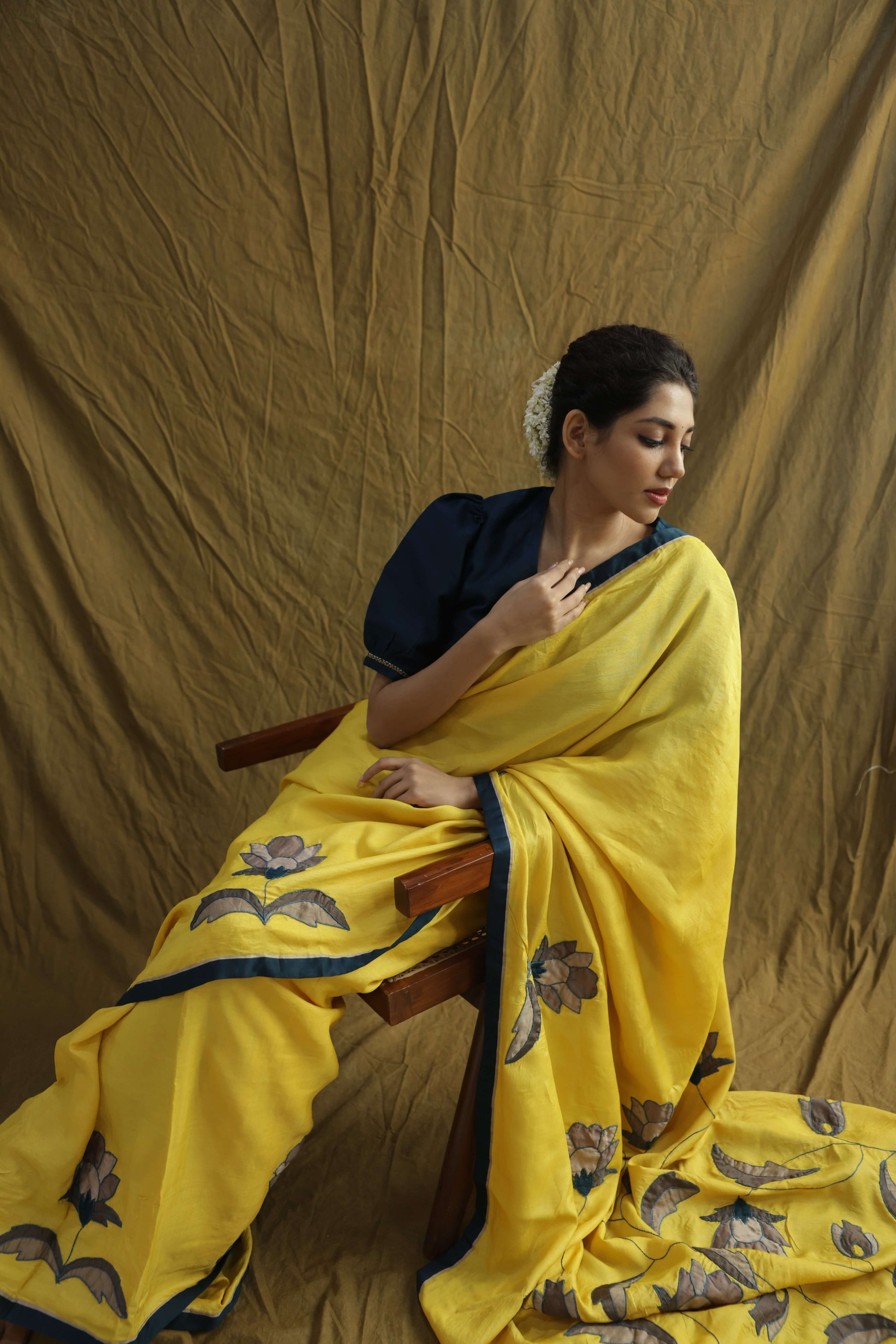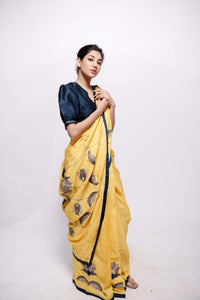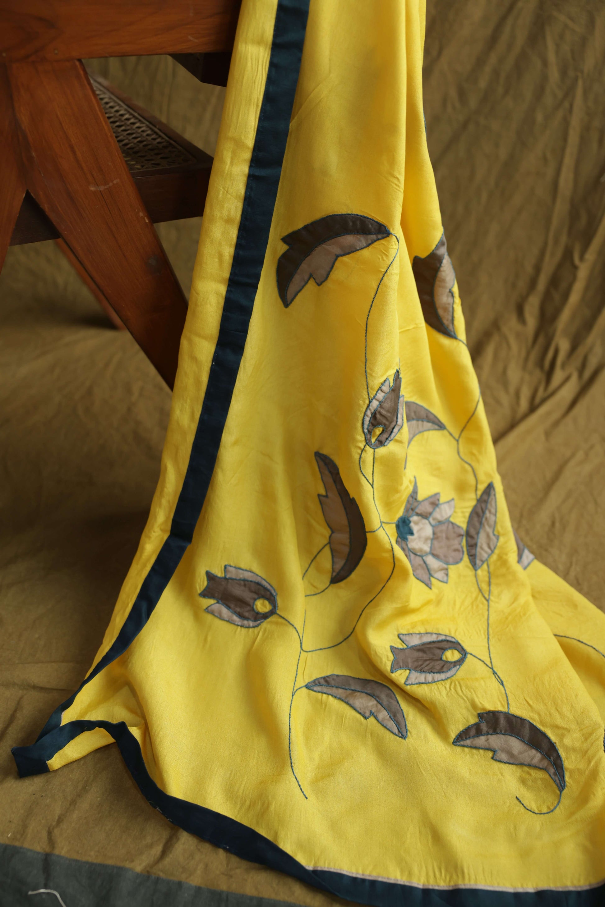 Yellow wild silk saree with floral applique work on palla and hem. The saree has 1 inch of teal chanderi border finishing. The saree is paired with a stitched v neck and puff sleeve teal chanderi sujani embroidered blouse for styling purpose only. Comes with an unstitched chanderi blouse piece.